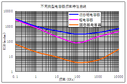 圖1 固態鋁電容與其他類型電容的頻率特性比較