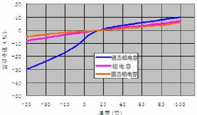 4)固態鋁電容器的溫度特性優良,可以在較寬的溫度范圍內保持容量的穩定(見圖2),且ESR值幾乎不隨溫度發生改變(見圖3),因此,可以應用于低溫或高溫環境中的設備;