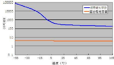 圖3 液態、固態鋁電容器的ESR-溫度變化曲線